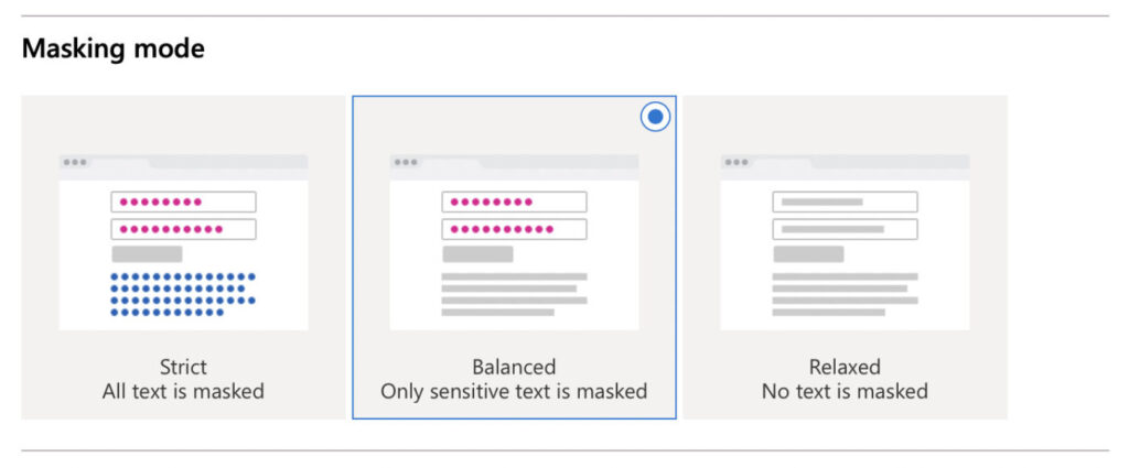 - Balanced:取り扱いに注意が必要なテキストのみマスキング