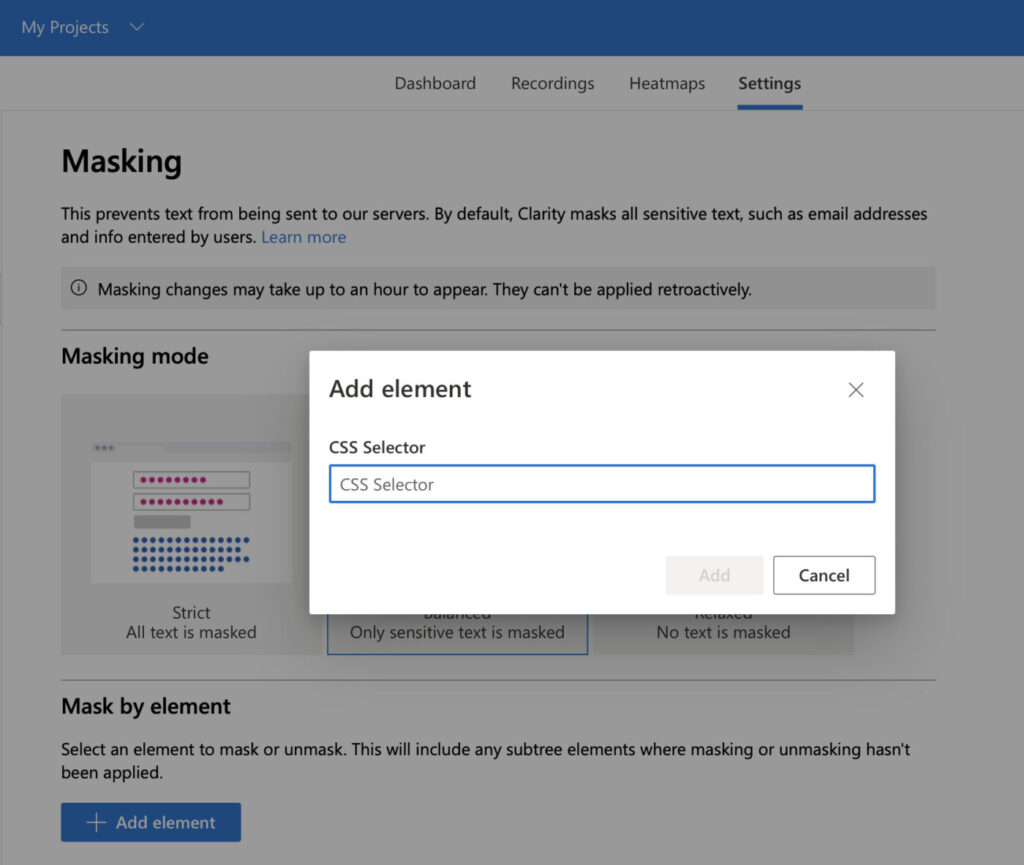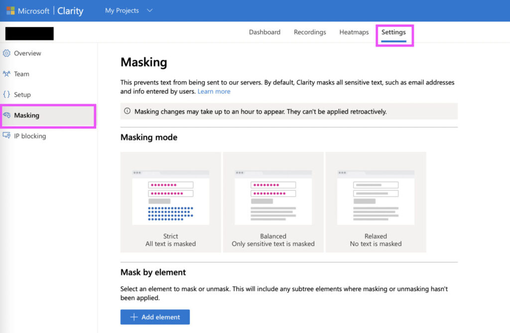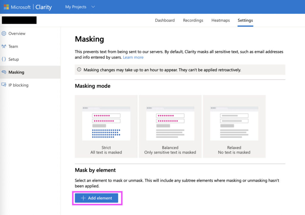 Microsoft Clarityには便利な機能があり、CSSのセレクターで個人情報をマスキングできるというものです。マスキングを設定すると当該情報は非公開となり、Clarityにアップロードされないようになります。
