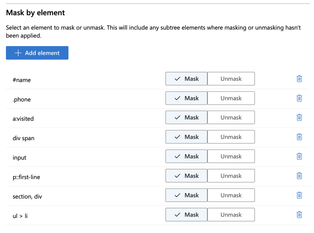 追加が完了すると「Add element」ボタンの下にCSSセレクタ名とマスキングあり、なしの設定ボタンが表示されます。該当CSSセレクタ名の横の「Mask」ボタンにチェックがついていればマスキングが設定されています。